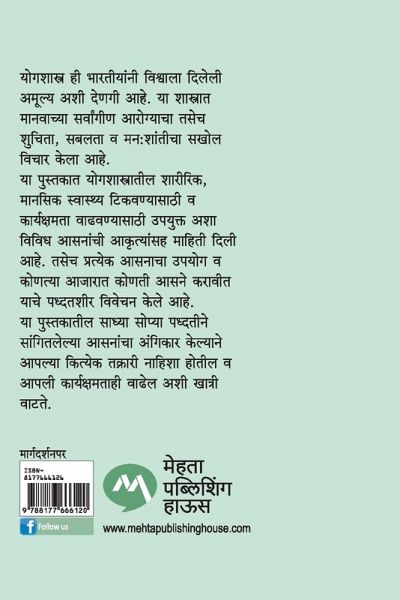 This book gives you complete guide to yoga that integrates of breath with movement for age of peoples with All levels of fitness, offering a progressive eight-week program designed to enhance health. Provides information to parents on yoga positions suitable for children, with step-by-step directions, including yoga games and advice on yoga for children with disabilities...योगशास्त्र ही भारतीयांनी विश्वाला दिलेली अमूल्य अशी देणगी आहे. या शास्त्रात मानवाच्या सर्वांगीण आरोग्याचा तसेच शुचिता, सबलता व मन शांतीचा सखोल विचार केला आहे. या पुस्तकात योगशास्त्रातील शारीरिक, मानसिक स्वास्थ्य टिकवण्यासाठी व कार्यक्षमता वाढवण्यासाठी उपयुक्त अशा विविध आसनांची आकृत्यांसह माहिती दिली आहे. तसेच प्रत्येक आसनाचा उपयोग व कोणत्या आजारात कोणती आसने करावीत याचे पध्दतशीर विवेचन केले आहे. या पुस्तकातील साध्या सोप्या पध्दतीने सांगितलेल्या आसनांचा अंगिकार केल्याने आपल्या कित्येक तक्रारी नाहिशा होतील व आपली कार्यक्षमताही वाढेल अशी खात्री वाटते.