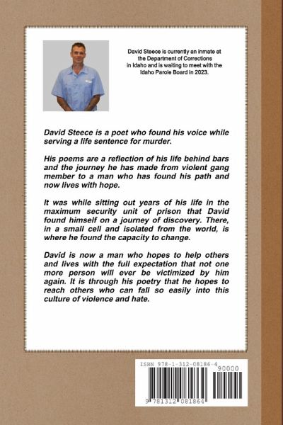 David Steece is a poet that has come from a life of hate and violence, but through a simple biology book and self-teachings, he now lives in a new world full of beautiful words and poetry. He is currently incarcerated and through his poems David shares with readers what it is like to live in a cell and how his memories of freedom fill his days.