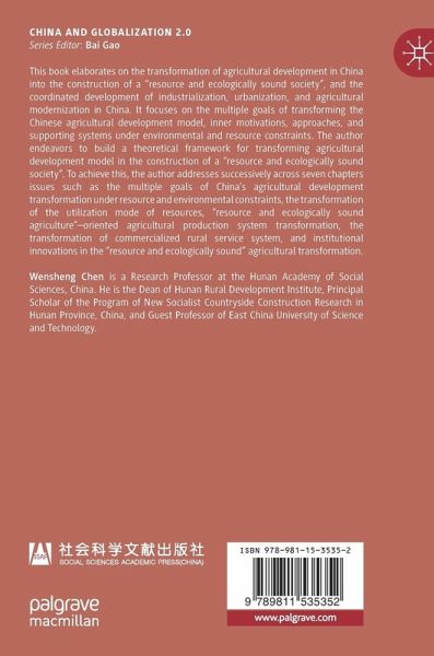 This book elaborates on the transformation of agricultural development in China into the construction of a "resource and ecologically sound society", and the coordinated development of industrialization, urbanization, and agricultural modernization in China. It focuses on the multiple goals of transforming the Chinese agricultural development model, inner motivations, approaches, and supporting systems under environmental and resource constraints. The author endeavors to build a theoretical framework for transforming agricultural development model in the construction of a "resource and ecologically sound society". To achieve this, the author addresses successively across seven chapters issues such as the multiple goals of China's agricultural development transformation under resource and environmental constraints, the transformation of the utilization mode of resources, "resource and ecologically sound agriculture"-oriented agricultural production system transformation, the transformation of commercialized rural service system, and institutional innovations in the "resource and ecologically sound" agricultural transformation.
