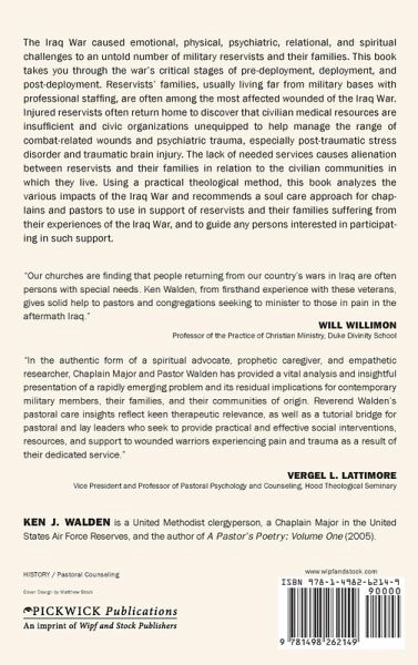 Description: The Iraq War caused emotional, physical, psychiatric, relational, and spiritual challenges to an untold number of military reservists and their families. This book takes you through the war's critical stages of pre-deployment, deployment, and post-deployment. Reservists' families, usually living far from military bases with professional staffing, are often among the most affected wounded of the Iraq War. Injured reservists often return home to discover that civilian medical resources are insufficient and civic organizations unequipped to help manage the range of combat-related wounds and psychiatric trauma, especially post-traumatic stress disorder and traumatic brain injury. The lack of needed services causes alienation between reservists and their families in relation to the civilian communities in which they live. Using a practical theological method, this book analyzes the various impacts of the Iraq War and recommends a soul care approach for chaplains and pastors to use in support of reservists and their families suffering from their experiences of the Iraq War, and to guide any persons interested in participating in such support. Endorsements: ""Our churches are finding that people returning from our country's wars in Iraq are often persons with special needs. Ken Walden, from firsthand experience with these veterans, gives solid help to pastors and congregations seeking to minister to those in pain in the aftermath of Iraq."" --Will Willimon Professor of the Practice of Christian Ministry, Duke Divinity School ""In the authentic form of a spiritual advocate, prophetic caregiver, and empathetic researcher, Chaplain Major and Pastor Walden has provided a vital analysis and insightful presentation of a rapidly emerging problem and its residual implications for contemporary military members, their families, and their communities of origin. Reverend Walden's pastoral care insights reflect keen therapeutic relevance, as well as a tutorial bridge for pastoral and lay leaders who seek to provide practical and effective social interventions, resources, and support to wounded warriors experiencing pain and trauma as a result of their dedicated service."" --Vergel L. Lattimore Vice President and Professor of Pastoral Psychology and Counseling Hood Theological Seminary About the Contributor(s): Ken Walden is a United Methodist clergyperson, a Chaplain Major in the United States Air Force Reserves, and the author of A Pastor's Poetry: Volume One (2005).
