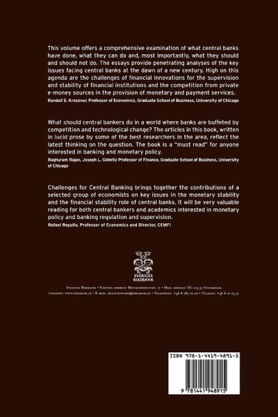 `This volume offers a comprehensive examination of what central banks have done, what they can do and, most importantly, what they should and should not do. The essays provide penetrating analyses of the key issues facing central banks at the dawn of a new century. High on this agenda are the challenges of financial innovations for the supervision and stability of financial institutions and the competition from private e-money sources in the provision of monetary and payment services.' R.S. Kroszner, Professor of Economics, Graduate School of Business, University of Chicago `What should central bankers do in a world where banks are buffeted by competition and technological change? The articles in this book, written in lucid prose by some of the best researchers in the area, reflect the latest thinking on the question. The book is a `must read' for anyone interested in banking and monetary policy.' R. Rajan, J.L. Gidwitz Professor of Finance, Graduate School of Business, University of Chicago `Challenges for Central Banking brings together the contributions of a selected group of economists on key issues in the monetary stability and the financial stability role of central banks. It will be very valuable reading for both central bankers and academics interested in monetary policy and banking regulation and supervision.' R. Repullo, Professor of Economics and Director, CEMFI