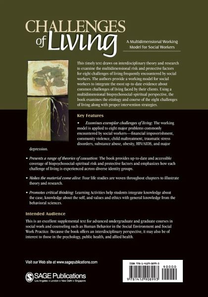 The book provides a working model for social workers to integrate the most up-to-date evidence about challenges of living encountered in their daily practice. Using a multidimensional biopsychosocial-spiritual perspective, the book examines etiology, course and intervention strategies related to 8 challenges of living. The book presents a range of theories of causation and brings together the most recent interdisciplinary research on risk and protective factors in each chapter. Each chapter is organized according to the features of the working model and includes: " narrative story (or stories) " theories of causation " patterns of occurrence across gender, race/ethnicity, age, socioeconomic status, sexual orientation, disability " biological risk and protective factors " psychological risk and protective factors " social risk and protective factors " spiritual risk and protective factors " integration of biopsychosocial-spiritual dimensions " ways that people attempt to cope " social justice issues " implications for social work policy and practice.