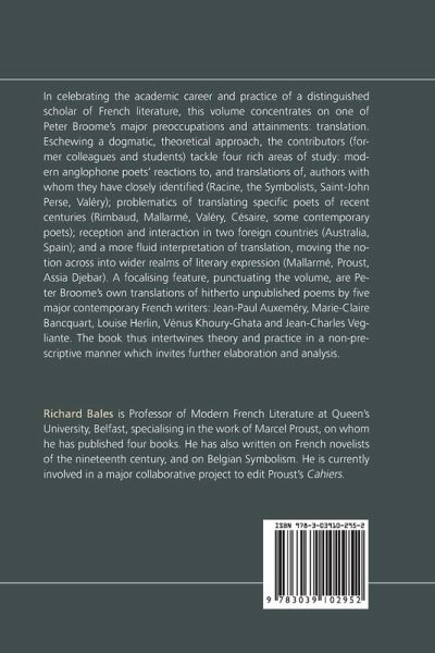 In celebrating the academic career and practice of a distinguished scholar of French literature, this volume concentrates on one of Peter Broome's major preoccupations and attainments: translation. Eschewing a dogmatic, theoretical approach, the contributors (former colleagues and students) tackle four rich areas of study: modern anglophone poets' reactions to, and translations of, authors with whom they have closely identified (Racine, the Symbolists, Saint-John Perse, Valéry); problematics of translating specific poets of recent centuries (Rimbaud, Mallarmé, Valéry, Césaire, some contemporary poets); reception and interaction in two foreign countries (Australia, Spain); and a more fluid interpretation of translation, moving the notion across into wider realms of literary expression (Mallarmé, Proust, Assia Djebar). A focalising feature, punctuating the volume, are Peter Broome's own translations of hitherto unpublished poems by five major contemporary French writers: Jean-Paul Auxeméry, Marie-Claire Bancquart, Louise Herlin, Vénus Khoury-Ghata and Jean-Charles Vegliante. The book thus intertwines theory and practice in a non-prescriptive manner which invites further elaboration and analysis.