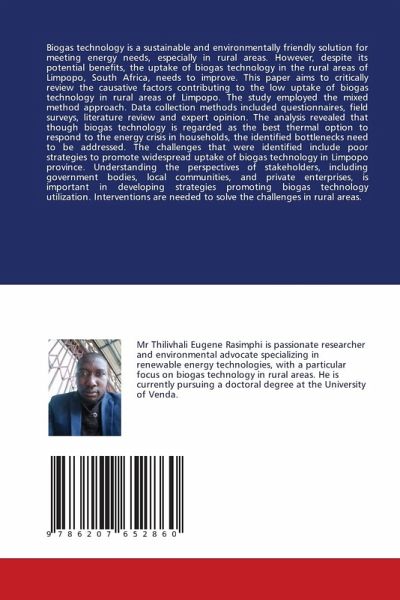 Biogas technology is a sustainable and environmentally friendly solution for meeting energy needs, especially in rural areas. However, despite its potential benefits, the uptake of biogas technology in the rural areas of Limpopo, South Africa, needs to improve. This paper aims to critically review the causative factors contributing to the low uptake of biogas technology in rural areas of Limpopo. The study employed the mixed method approach. Data collection methods included questionnaires, field surveys, literature review and expert opinion. The analysis revealed that though biogas technology is regarded as the best thermal option to respond to the energy crisis in households, the identified bottlenecks need to be addressed. The challenges that were identified include poor strategies to promote widespread uptake of biogas technology in Limpopo province. Understanding the perspectives of stakeholders, including government bodies, local communities, and private enterprises, is important in developing strategies promoting biogas technology utilization. Interventions are needed to solve the challenges in rural areas.