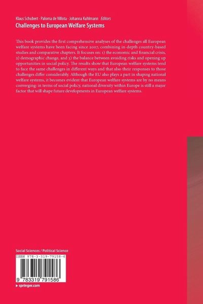 Thisbook provides the first comprehensive analyses of the challenges all Europeanwelfare systems have been facing since 2007, combining in-depth country-basedstudies and comparative chapters. It focuses on: 1) the economic and financialcrisis, 2) demographic change, and 3) the balance between avoiding risks andopening up opportunities in social policy. The results show that Europeanwelfare systems tend to face the same challenges in different ways and thatalso their responses to those challenges differ considerably. Although the EUalso plays a part in shaping national welfare systems, it becomes evident thatEuropean welfare systems are by no means converging: in terms of social policy,national diversity within Europe is still a major factor that will shape futuredevelopments in European welfare systems.