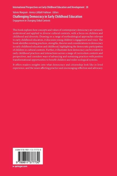 Section 1 Introductory section.- 1 Introduction: Content and Context.- 2 The preschool as an arena for democratic education: A framework for teacher roles and child outcomes.- Section 2 Democracy in early childhood curriculum and policy.- 3 Ethical issues in child research: Caution of ethical drift.- 4 Talent development in preschool curriculum and policies: Implicit recognition of young gifted children.- 5 Parental decision-making about school start age in Australia: Democratic for whom?.- 6 Democracy and multilingualism in South African primary education: Implications for early literacy development.- 7 Engagement of children of Finnish descent in bilingual communicative events in Swedish preschool contexts.- Section III Espoused and enacted EC pedagogical practice.- 8 Banning the "Incompetent Child" in pedagogical documentation and discourse.- 9 Parent-Teacher-Child communication and advocacy: A community intervention.- 10 Time to tell more stories: Children, democracy and educationin movement.- 11 Establishing a learner identity: Young digital citizens and the pursuit of a democratic and empowering early childhood education.- 12 Democratic discourses in higher education: Australian preservice student teacher perceptions of quality early childhood education.- Section IV Children's democratic arenas.- 13 Narratives of belonging: Migrant children's friendship negotiation.- 14 Inclusive practice for all: Child perspectives.- 15 Toddlers enacting democracy through communication in preschool.- 16 Preschool children as democratic subjects: Agents of democracy.- 17 Preschool children's resilience: An ecological perspective in a Taiwanese context.- Section V Conclusion.- 18 Challenging the challenges: Democratic spaces and opportunities in ECE.