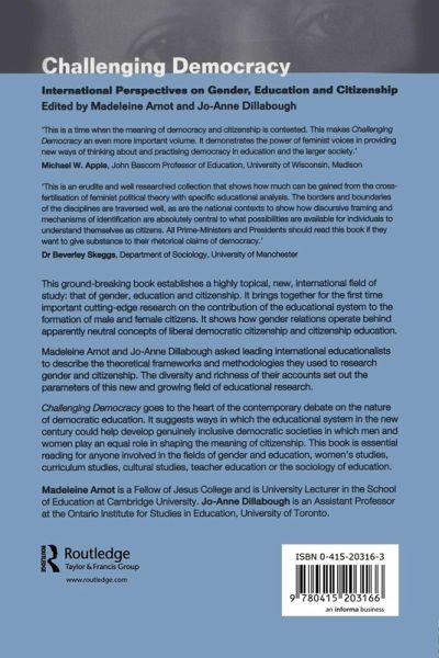 Chapter 1 Introduction Madeleine Arnot Jo-Anne Dillabough; Part 1 Discursive framings of female citizenship and female education; Chapter 2 Feminist political frameworks Jo-Anne Dillabough Madeleine Arnot; Chapter 3 Citizenship identity and social justice Ann Brooks; Chapter 4 Redefining citizenship Heidi Safia Mirza Diane Reay; Chapter 5 Embodied identity Lynda Stone; Chapter 6 Transnational visions of the 1990s Elaine Unterhalter; Part 2 Teachers' identities and public identifications; Chapter 7 Motherhood and citizenship Helena C. Araújo; Chapter 8 No women wanted on the social frontier Kathleen Weiler; Chapter 9 Student teachers' representations of citizenship G. Ivinson H. Arnot H. Hraújo K. Deliyanni A. Tomé; Chapter 10 Women in teacher education Jo-Anne Dillabough; Part 3 Schooling and the construction of the gendered citizen; Chapter 11 From pupil to citizen Tuula Gordon Janet Holland Elina Lahelma; Chapter 12 Is female educational 'success' destabilising the male learner-citizen? Victoria Foster; Chapter 13 Discipline and democracy Christine Callender Cecile Wright; Chapter 14 Young women in Argentina Gloria Bonder; Part 4 Citizenship education and new democratic agendas; Chapter 15 Sexuality and citizenship education Sue Lees; Chapter 16 The civil school and civil society Lynn Davies; Chapter 17 Defining a civic agenda Penny Enslin; Chapter 18 Cyberfeminism and citizenship? Jane Kenway Diana Langmead;