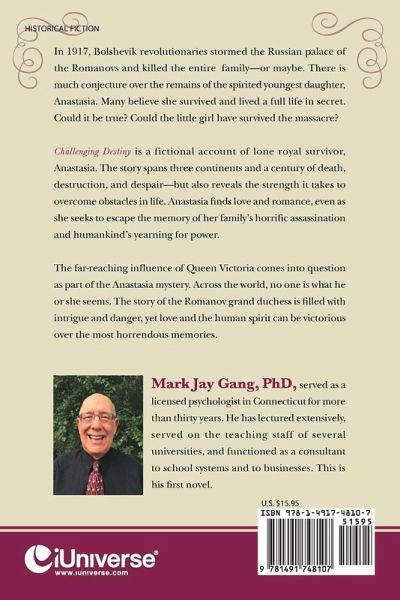 In 1917, Bolshevik revolutionaries stormed the Russian palace of the Romanovs and killed the entire family-or maybe. There is much conjecture over the remains of the spirited youngest daughter, Anastasia. Many believe she survived and lived a full life in secret. Could it be true? Could the little girl have survived the massacre? Challenging Destiny is a fictional account of lone royal survivor, Anastasia. The story spans three continents and a century of death, destruction, and despair-but also reveals the strength it takes to overcome obstacles in life. Anastasia finds love and romance, even as she seeks to escape the memory of her family's horrific assassination and humankind's yearning for power. The far-reaching influence of Queen Victoria comes into question as part of the Anastasia mystery. Across the world, no one is what he or she seems. The story of the Romanov grand duchess is filled with intrigue and danger, yet love and the human spirit can be victorious over the most horrendous memories.
