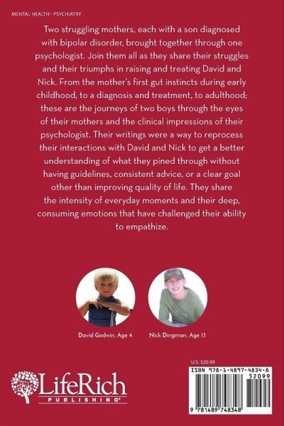 "Two struggling mothers, each with a son diagnosed with bipolar disorder, brought together through one psychologist. Join them all as they share their struggles and their triumphs in raising and treating David and Nick. From the mother's first gut instincts during early childhood, to a diagnosis and treatment, to adulthood; these are the journeys of two boys through the eyes of their mothers and the clinical impressions of their psychologist. Their writings were a way to reprocess their interactions with David and Nick to get a better understanding of what they pined through without having guidelines, consistent advice, or a clear goal other than improving quality of life. They share the intensity of everyday moments and their deep, consuming emotions that have challenged their ability to empathize."