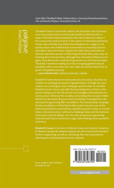 'Elizabeth Friesen's new book contests the dominant view of finance as an impossibly arcane, technical and apolitical field best left to experts. The book instead emphasizes the role of ideas and values in the construction and evolution of the system of international finance. Friesen also carefully documents the emergence of a range of civil society actors who mobilized (to some extent successfully) around alternative ideas and values. Despite the odds, these transnational activists had some success in reforming dominant ways of thinking about the economy, although they ultimately failed to put in place more democratic methods of governance in the financial realm. This book is essential reading at a time of ongoing global financial instability when, more than ever, new ideas are needed about how to govern the global economy.' - Laura Macdonald, Carleton University, Canada.
