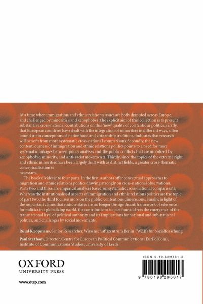 At a time when immigration and ethnic relations issues are hotly disputed across Europe, and challenged by minorities and xenophobes, the explicit aim of this collection is to present substantive cross-national contributions on this new quality of contentious politics. That European countries have dealt with the integration of minorities in different ways, often bound up in conceptions of nationhood and citizenship traditions, indicates that research will benefit from more systematic cross-national comparisons. Secondly, the new contentiousness of immigration and ethnic relations politics points to a need for more systematic linkages between policy analyses and the public conflicts that are mobilized by xenophobic, minority, and anti-racist movements. Thirdly, since the topics of the extreme right and ethnic minorities have been largely dealt with as distinct fields, a greater cross-thematic conceptualisation is necessary The book divides into four parts. In the first, authors offer conceptual approaches to migration and ethnic relations politics drawing strongly on cross-national observations. Parts two and three are empirical analyses based on a method of systematic cross-national comparison. Whereas the institutionalised aspects of immigration and ethnic relations politics are the topic of part two, the third focuses more on the public contentious dimensions. Finally, in light of the important claims that nation-states are no longer the significant framework of reference for politics in a globalizing world, the contributions to part four address the emergence of the transnational level of political authority and its implications for national and sub-national politics, and challenges by social movements.