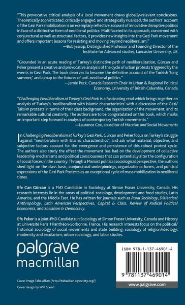 "Challenging Neoliberalism at Turkey's Gezi Park is a fascinating read which brings together an analysis of Turkey's "neoliberalism with Islamic characteristics" with adiscussion of the Gezi/Taksim protests in terms of their class background, the organization of the movement and its remarkable cultural creativity. The authors are to be congratulated on this book, which marks an important step forward in analysis of contemporary Turkish movements." - Laurence Cox, Director of the MA in Community Education, Equality and Social Activism, Maynooth University, Ireland