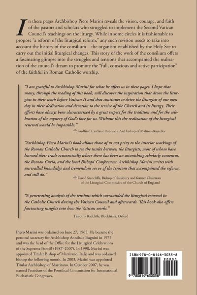 In these pages Archbishop Piero Marini reveals the vision, courage, and faith of the pastors and scholars who struggled to implement the Second Vatican Council's teachings on the liturgy. While in some circles it is fashionable to propose "a reform of the liturgical reform," any such revision needs to take into account the history of the consilium-the organism established by the Holy See to carry out the initial liturgical changes. This story of the work of the consilium offers a fascinating glimpse into the struggles and tensions that accompanied the realization of the council's dream to promote the "full, conscious and active participation" of the faithful in Roman Catholic worship.