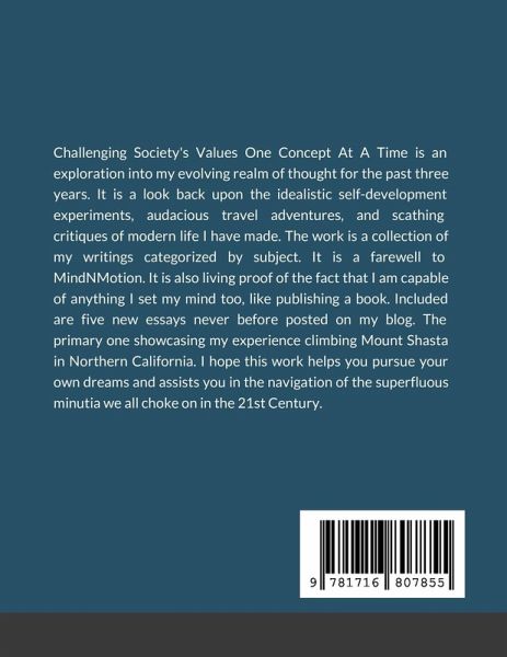 Challenging Society's Values One Concept At A Time is an exploration into my evolving realm of thought for the past three years. It is a look back upon the idealistic self-development experiments, audacious travel adventures, and scathing critiques of modern life I have made. The work is a collection of my writings categorized by subject. It is a farewell to MindNMotion. It is also living proof of the fact that I am capable of anything I set my mind too, like publishing a book. Included are five new essays never before posted on my blog. The primary one being my experience climbing Mount Shasta in Northern California. I hope the work helps you pursue your own dreams and assists you in the navigation of the superfluous minutia we all choke on in the 21st Century.