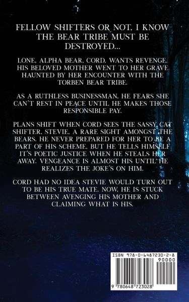 Fellow shifters or not, I know the bear tribe must be destroyed... Lone, alpha bear, Cord, wants revenge. His beloved mother went to her grave haunted by her encounter with the Torben Bear Tribe. As a ruthless businessman, he fears she can't rest in peace until he makes those responsible pay. Plans shift when Cord sees the sassy cat shifter, Stevie, a rare sight amongst the bears. He never prepared for her to be a part of his scheme, but he tells himself it's poetic justice when he steals her away. Vengeance is almost his until he realizes the joke's on him. Cord had no idea Stevie would turn out to be his true mate. Now, he is stuck between avenging his mother and claiming what is his. One-click today and find out if love is enough for Cord reconcile his need to avenge his mother's past with his hope for a future of his own.