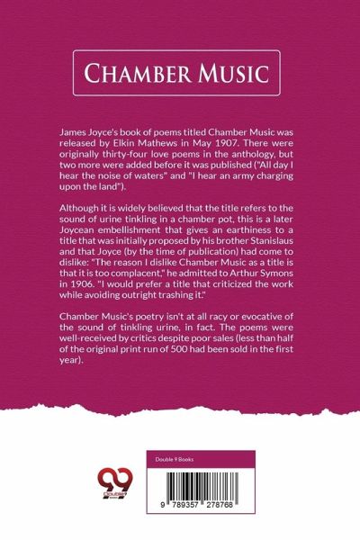 James Joyce's book of poems titled Chamber Music was released by Elkin Mathews in May 1907. There were originally thirty-four love poems in the anthology, but two more were added before it was published ("All day I hear the noise of waters" and "I hear an army charging upon the land"). Although it is widely believed that the title refers to the sound of urine tinkling in a chamber pot, this is a later Joycean embellishment that gives an earthiness to a title that was initially proposed by his brother Stanislaus and that Joyce (by the time of publication) had come to dislike: "The reason I…mehr