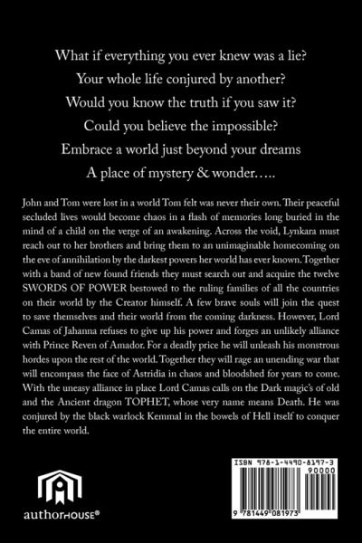 What if everything you ever knew was a lie? Your whole life conjured by another? Would you know the truth if you saw it? Could you believe the impossible? Embrace a world just beyond your dreams A place of mystery & wonder..... John and Tom were lost in a world Tom felt was never their own. Their peaceful secluded lives would become chaos in a flash of memories long buried in the mind of a child on the verge of an awakening. Across the void, Lynkara must reach out to her brothers and bring them to an unimaginable homecoming on the eve of annihilation by the darkest powers her world has ever known. Together with a band of new found friends they must search out and acquire the twelve SWORDS OF POWER bestowed to the ruling families of all the countries on their world by the Creator himself. A few brave souls will join the quest to save themselves and their world from the coming darkness. However, Lord Camas of Jahanna refuses to give up his power and forges an unlikely alliance with Prince Reven of Amador. For a deadly price he will unleash his monstrous hordes upon the rest of the world. Together they will rage an unending war that will encompass the face of Astridia in chaos and bloodshed for years to come. With the uneasy alliance in place Lord Camas calls on the Dark magic's of old and the Ancient dragon TOPHET, whose very name means Death. He was conjured by the black warlock Kemmal in the bowels of Hell itself to conquer the entire world.