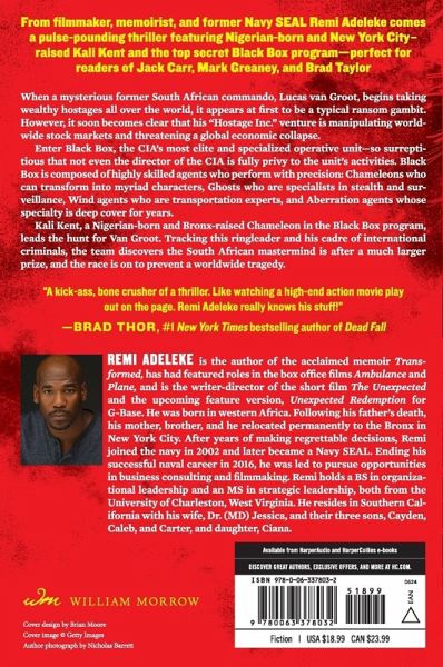 "Delivering authentic action from someone who has lived it, Chameleon is on target and scores a direct hit!" -Jack Carr, former Navy SEAL and #1 New York Times bestselling authorFrom filmmaker, memoirist, and former Navy SEAL Remi Adeleke, on the heels of his featured roles in the hit film Plane and in Fox's Special Forces: World's Toughest Test, comes the first installment in the pulse-pounding Black Box Thriller series, featuring Nigerian-born and New York-raised Kali Kent and the top-secret Black Box program-perfect for readers of Jack Carr, Mark Greaney, and Brad Taylor. When a mysterious former South African commando, Lucas Van Groot, begins taking wealthy hostages all over the world, it appears at first to be a typical ransom gambit. However, it soon becomes clear that his "Hostage Inc." venture is manipulating worldwide stock markets and threatening global economic collapseEnter Black Box, the CIA's elite, secret special operations branch-so surreptitious that not even the Director of CIA is fully privy to the unit's activities. Black Box is composed of highly skilled agents who perform with precision: Chameleons who can transform into myriad characters, Ghosts who are specialists in stealth and surveillance,Wind operatives who are transportation experts, andAberration agents whose specialty is deep cover for years. Kali Kent, a Nigerian born and Bronxite Chameleon in the Black Box program, leads the hunt for Van Groot. Tracking this ringleader and his cadre of international criminals, the team discovers the South African mastermind is after a much larger prize and the race is on to prevent a worldwide tragedy. Along the way, Kali will have to face the demons from his childhood and reflect on his emotional path that made him the Chameleon that he is today.
