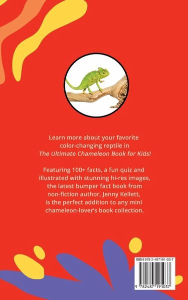 Leap into the Colorful World of Chameleons! Is your child enchanted by the world of reptiles? Introducing "The Ultimate Chameleon Book for Kids" by esteemed non-fiction author and trainee zookeeper, Jenny Kellett. Perfectly tailored for inquisitive minds aged 9-12, this comprehensive guide offers a fresh look into the enchanting realm of chameleons. With vivid, full-color photographs that bring these colorful creatures to life, this book promises a journey like no other. Dive Deeper Into the World of Chameleons:Explore a handpicked selection of chameleon species from across the globe. Understand their mesmerizing adaptations: from 360-degree vision to their unique color transformations. Delve into their habitats, from lush rainforests to the highlands of Africa. Recognize the vital role chameleons play in our environment and their place in popular culture. Engage, Learn, and Play! The excitement doesn't end with reading! Kids can challenge themselves with a detailed quiz and immerse in a chameleon-themed word search puzzle. They'll also discover a treasure trove of over 50 intriguing chameleon facts. Highlights of the Book:Striking Full-Color Photographs Insightful, Kid-friendly Content Entertaining Quiz and Word Search Over 50 Unique Chameleon Facts With "The Ultimate Chameleon Book for Kids," young readers will not only satisfy their curiosity but will also gain a deeper appreciation for these amazing reptiles. It's the essential chameleon guide that balances education with pure enjoyment. Grab a copy today and watch your child's fascination grow!