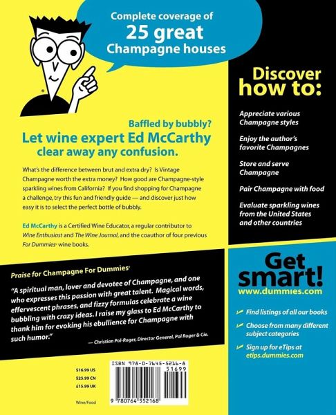 Discover how toAppreciate various Champagne stylesStore and serve ChampagnesPair Champagne with foodEvaluate sparkling wines from the United States and other countriesWith complete coverage of 25 great Champagne houses, you can enjoy the author's favorite Champagnes. Here's what French Champagne-house Director Christian Pol-Roger had to say about Author Ed McCarthy and "Champagne For Dummies":
