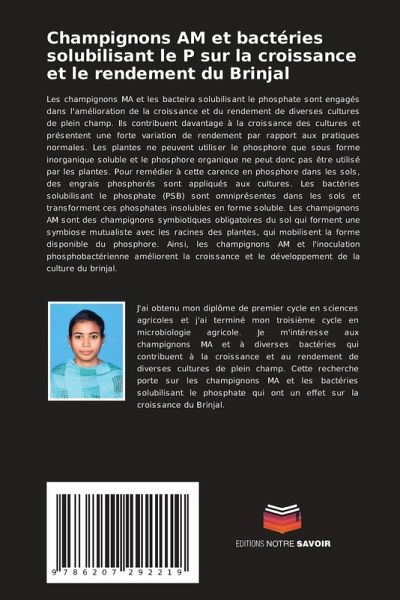 Les champignons MA et les bacteira solubilisant le phosphate sont engagés dans l'amélioration de la croissance et du rendement de diverses cultures de plein champ. Ils contribuent davantage à la croissance des cultures et présentent une forte variation de rendement par rapport aux pratiques normales. Les plantes ne peuvent utiliser le phosphore que sous forme inorganique soluble et le phosphore organique ne peut donc pas être utilisé par les plantes. Pour remédier à cette carence en phosphore dans les sols, des engrais phosphorés sont appliqués aux cultures. Les bactéries solubilisant le phosphate (PSB) sont omniprésentes dans les sols et transforment ces phosphates insolubles en forme soluble. Les champignons AM sont des champignons symbiotiques obligatoires du sol qui forment une symbiose mutualiste avec les racines des plantes, qui mobilisent la forme disponible du phosphore. Ainsi, les champignons AM et l'inoculation phosphobactérienne améliorent la croissance et le développement de la culture du brinjal.