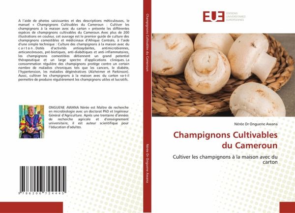 A l'aide de photos saisissantes et des descriptions méticuleuses, le manuel « Champignons Cultivables du Cameroun : Cultiver les champignons à la maison avec du carton » présente les différentes espèces de champignons cultivables du Cameroun. Avec plus de 200 illustrations en couleur, cet ouvrage est le premier guide de culture des champignons comestibles et médicinaux d'Afrique Centrale, à l'aide d'une simple technique : Culture des champignons à la maison avec du carton. Dotés d'activités antioxydantes, antimicrobiennes, anticancéreuses, pré-biotiques, anti-diabétiques et anti-inflammatoires, les champignons comestibles détiennent un grand potentiel thérapeutique et un large spectre d'applications cliniques. La consommation régulière des champignons protège contre un certain nombre de maladies chroniques tels que les cancers, le diabète, l'hypertension, les maladies dégénératives (Alzheimer et Parkinson). Aussi, cultiver les champignons à la maison avec du carton va-t-il permettre de produire régulièrement les champignons utiles et lucratifs.