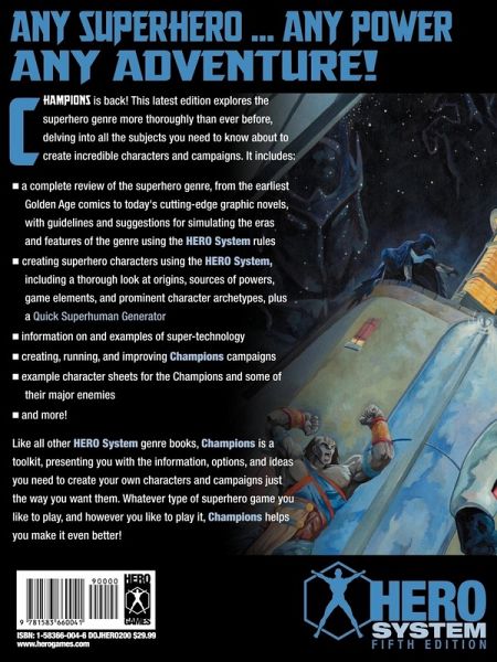 ANY SUPERHERO... ANY POWER... ANY ADVENTURE! Champions is back! This latest edition explores the superhero genre more thoroughly than ever before, delving into all the subjects you need to know about to create incredible characters and campaigns. It includes: - a complete review of the superhero genre, from the earliest Golden Age comics to today's cutting-edge graphic novels, with guidelines and suggestions for simulating the eras and features of the genre using the HERO System rules - creating superhero characters using the HERO System, including a thorough look at origins, sources of powers, game elements, and prominent character archetypes, plus aQuick Superhuman Generator - information on and examples of super-technology - creating, running, and improving Champions campaigns - examples of character sheets for the Champions and some of their major enemies - and more! Like all other HERO System genre books, Champions is a toolkit, presenting you with the information, options, and ideas you need tto create your own characters and campaigns just the way you want them, Whatever type of superhero game you like to play, and however you like to play it, Champions helps you make it even better! Champions is usable as a stand-alone product, but does not include the HERO System rules, only discussions of how to apply those rules. For the rules themselves, you’ll need the HERO System 5th Edition core rulebook.