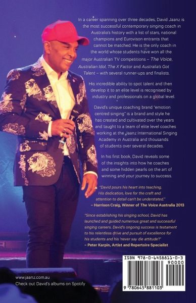 In a career spanning over three decades, David Jaanz is the most successful contemporary singing coach in Australia's history with a list of stars, national champions and Eurovison entrants that cannot be matched. He is the only coach in the world whose students have won all the major Australian TV competitions - The Voice, Australian Idol, The X Factor and Australia's Got Talent - with several runner-ups and finalists. His incredible ability to spot talent and then develop it to an elite level is recognised by industry and professionals on a global level. David's unique coaching brand "emotion centred singing" is a brand and style he has created and cultivated over the years and taught to a team of elite level coaches working at the Jaanz International Singing Academy in Australia and thousands of students over several decades. In his first book, David reveals some of the insights into how he coaches and some hidden pearls on the art of winning and your journey to success.