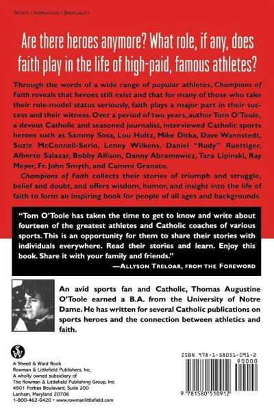 Are there heroes anymore? What role, if any, does faith play in the life of high-paid, famous athletes? Through the words of a wide range of popular athletes, Champions of Faith reveals that heroes still exist and that for many of those who take their role-model status seriously, faith plays a major part in their success and their witness. Over a period of two years, author Tom O'Toole, a devout Catholic and seasoned journalist, interviewed Catholic sports heroes such as Sammy Sosa, Lou Holtz, Mike Ditka, Dave Wannstedt, Suzie McConnell-Serio, Lenny Wilkens, "Rudy" Ruettiger, Alberto Salazar, Bobby Allison, Danny Abramowicz, Tara Lipinski, Ray Meyers, Fr. John Smyth, and Cammi Granto.