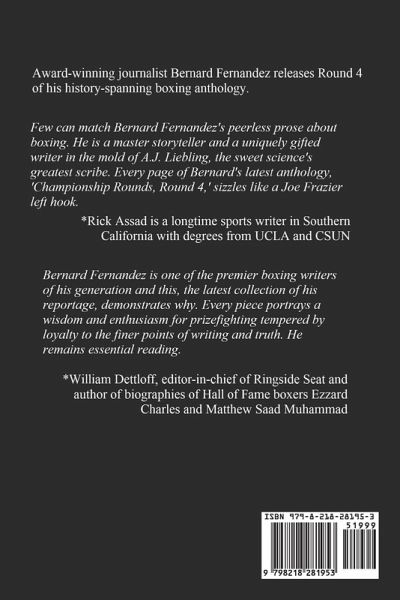 Award-winning journalist Bernard Fernandez releases Round 4 of his history-spanning boxing anthology. Few can match Bernard Fernandez's peerless prose about boxing. He is a master storyteller and a uniquely gifted writer in the mold of A.J. Liebling, the sweet science's greatest scribe. Every page of Bernard's latest anthology, 'Championship Rounds, Round 4,' sizzles like a Joe Frazier left hook. *Rick Assad is a longtime sports writer in Southern California with degrees from UCLA and CSUN Bernard Fernandez is one of the premier boxing writers of his generation and this, the latest collection of his reportage, demonstrates why. Every piece portrays a wisdom and enthusiasm for prizefighting tempered by loyalty to the finer points of writing and truth. He remains essential reading. *William Dettloff, editor-in-chief of Ringside Seat and author of biographies of Hall of Fame boxers Ezzard Charles and Matthew Saad Muhammad