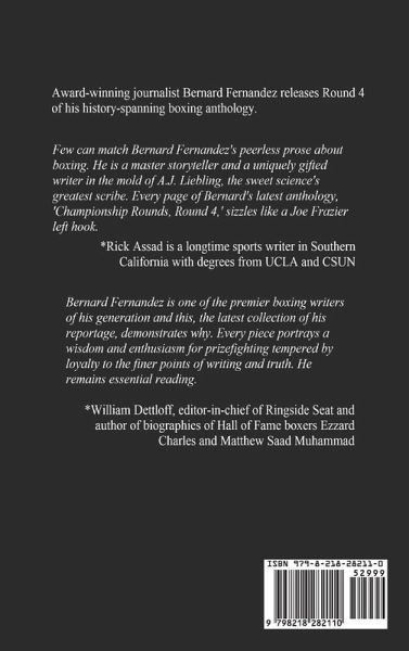 Award-winning journalist Bernard Fernandez releases Round 4 of his history-spanning boxing anthology. Few can match Bernard Fernandez's peerless prose about boxing. He is a master storyteller and a uniquely gifted writer in the mold of A.J. Liebling, the sweet science's greatest scribe. Every page of Bernard's latest anthology, 'Championship Rounds, Round 4,' sizzles like a Joe Frazier left hook. *Rick Assad is a longtime sports writer in Southern California with degrees from UCLA and CSUN Bernard Fernandez is one of the premier boxing writers of his generation and this, the latest collection of his reportage, demonstrates why. Every piece portrays a wisdom and enthusiasm for prizefighting tempered by loyalty to the finer points of writing and truth. He remains essential reading. *William Dettloff, editor-in-chief of Ringside Seat and author of biographies of Hall of Fame boxers Ezzard Charles and Matthew Saad Muhammad