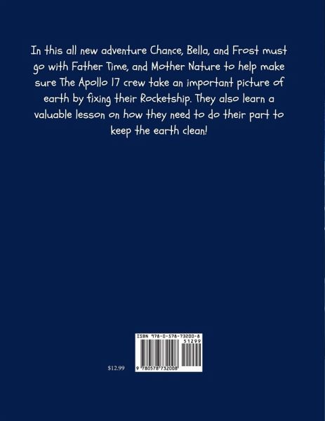 In this all new adventure Chance, Bella, and Frost must go with Father Time, and Mother Nature to help make sure The Apollo 17 crew take an important picture of earth by fixing their Rocketship. They also learn a valuable lesson on how they need to do their part to keep the earth clean! Your children will love this heartwarming children's adventure. Other books by this author: The Elf Who Wanted to be Santa