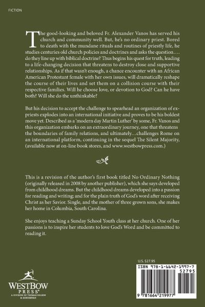 The good-looking and beloved Fr. Alexander Vanos has served his church and community well. But, he's no ordinary priest. Bored to death with the mundane rituals and routines of priestly life, he studies centuries old church policies and doctrines and asks the question....do they line up with biblical doctrine? Thus begins his quest for truth, leading to a life-changing decision that threatens to destroy close and supportive relationships. As if that wasn't enough, a chance encounter with an African American Protestant female with her own issues, will dramatically reshape the course of their lives and set them on a collision course with their respective families. Will he choose love, or devotion to God? Can he have both? Will she do the unthinkable? But his decision to accept the challenge to spearhead an organization of ex-priests explodes into an international initiative and proves to be his boldest move yet. Described as a 'modern day Martin Luther' by some, Fr. Vanos and this organization embarks on an extraordinary journey, one that threatens the boundaries of family relations, and ultimately...challenges Rome on an international platform, continuing in the sequel The Silent Majority, (available now at on-line book stores, and www.westbowpress.com.)