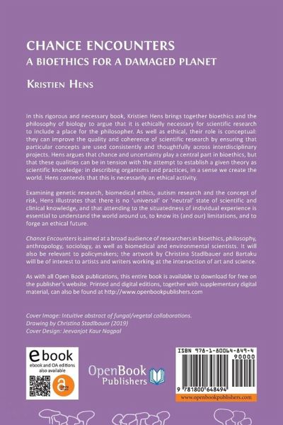 In this rigorous and necessary book, Kristien Hens brings together bioethics and the philosophy of biology to argue that the role of the philosopher in scientific research is ethically necessary, and that it can also improve the quality and coherence of the research itself, ensuring that concepts employed, be it genes or autism or development, are used consistently and thoughtfully across interdisciplinary projects. She argues that chance and uncertainty play a central role in bioethics, and we must therefore focus as much on what we know as on what we create: in describing organisms and practices we make the world. As such, this is necessarily an ethical activity. Examining genetic research, biomedical ethics, autism research and the concept of risk, Hens illustrates that there is no 'universal' or 'neutral' state of scientific and clinical knowledge, and that attending to the situatedness of individual experience is essential to understand the world around us, to know its (and our) limitations, and to forge an ethical future. Chance Encounters: Exploring the Ethics of Life is aimed at a broad audience of researchers in bioethics, philosophy, anthropology, sociology, as well as biomedical and environmental scientists. It will also be relevant to policymakers, and the artwork by Christina Stadlbauer and Bartaku will be of interest to artists and writers working at the intersection of art and science.