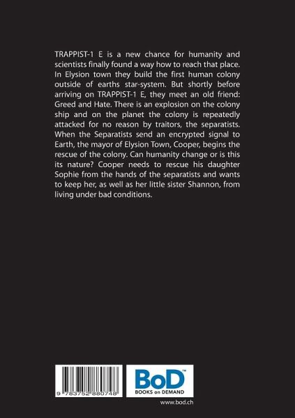 TRAPPIST-1 E is a new chance for humanity and scientists finally found a way how to reach that place. In Elysion town they build the first human colony outside of earths star-system. But shortly before arriving on TRAPPIST-1 E, they meet an old friend: Greed and Hate. There is an explosion on the colony ship and on the planet the colony is repeatedly attacked for no reason by traitors, the separatists. When the Separatists send an encrypted signal to Earth, the mayor of Elysion Town, Cooper, begins the rescue of the colony. Can humanity change or is this its nature? Cooper needs to rescue his daughter Sophie from the hands of the separatists and wants to keep her, as well as her little sister Shannon, from living under bad conditions.