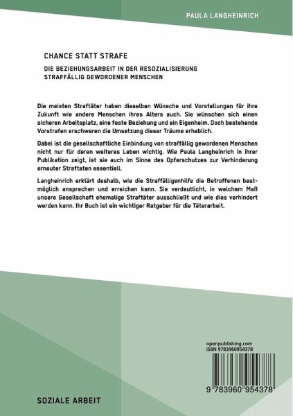 Die meisten Straftäter haben dieselben Wünsche und Vorstellungen für ihre Zukunft wie andere Menschen ihres Alters auch. Sie wünschen sich einen sicheren Arbeitsplatz, eine feste Beziehung und ein Eigenheim. Doch bestehende Vorstrafen erschweren die Umsetzung dieser Träume erheblich.Dabei ist die gesellschaftliche Einbindung von straffällig gewordenen Menschen nicht nur für deren weiteres Leben wichtig. Wie Paula Langheinrich in ihrer Publikation zeigt, ist sie auch im Sinne des Opferschutzes zur Verhinderung erneuter Straftaten essentiell.Langheinrich erklärt deshalb, wie die Straffälligenhilfe die Betroffenen bestmöglich ansprechen und erreichen kann. Sie verdeutlicht, in welchem Maß unsere Gesellschaft ehemalige Straftäter ausschließt und wie dies verhindert werden kann. Ihr Buch ist ein wichtiger Ratgeber für die Täterarbeit.Aus dem Inhalt:- Soziale Arbeit;- Haftstrafe;- Resozialisierung;- Wiedereingliederung;- Rückfallquote