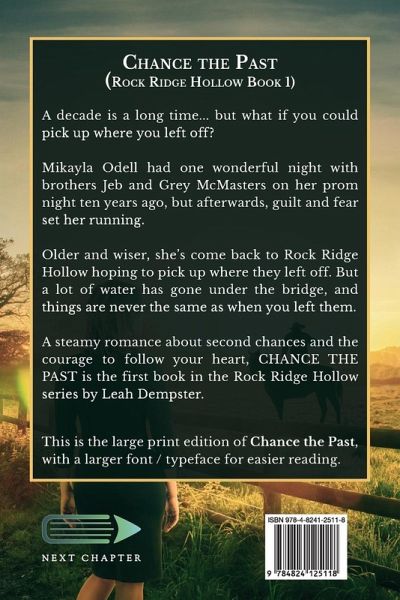 A decade is a long time... but what if you could pick up where you left off? Mikayla Odell had one wonderful night with brothers Jeb and Grey McMasters on her prom night ten years ago, but afterwards, guilt and fear set her running. Older and wiser, she's come back to Rock Ridge Hollow hoping to pick up where they left off. But a lot of water has gone under the bridge, and things are never the same as when you left them. A steamy romance about second chances and the courage to follow your heart, CHANCE THE PAST is the first book in the Rock Ridge Hollow series by Leah Dempster. This is the large print edition of Chance the Past, with a larger font / typeface for easier reading.