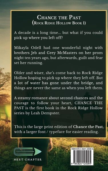 A decade is a long time... but what if you could pick up where you left off? Mikayla Odell had one wonderful night with brothers Jeb and Grey McMasters on her prom night ten years ago, but afterwards, guilt and fear set her running. Older and wiser, she's come back to Rock Ridge Hollow hoping to pick up where they left off. But a lot of water has gone under the bridge, and things are never the same as when you left them. A steamy romance about second chances and the courage to follow your heart, CHANCE THE PAST is the first book in the Rock Ridge Hollow series by Leah Dempster. This is the large print edition of Chance the Past, with a larger font / typeface for easier reading.