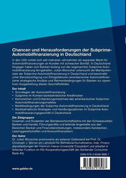 Grundlagen der Automobilfinanzierung.- Aspekte und Eigenschaften der Subprime-Automobilfinanzierung im Kontext bankbetrieblicher Kreditrisiken.- Marktbedingungen und Einflussfaktoren der Subprime-Automobilfinanzierung in Deutschland.- Bankbetriebliche Rahmenbedingungen und Ausgestaltungsmöglichkeiten der Subprime-Automobilfinanzierung in Deutschland.- Schlussfolgerungen und Ausblick.