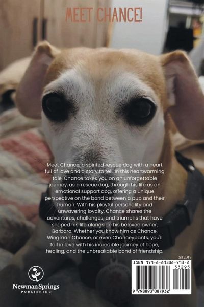 Meet Chance, a spirited rescue dog with a heart full of love and a story to tell. In this heartwarming tale, Chance takes you on an unforgettable journey as a rescue dog, through his life as an emotional support dog, offering a unique perspective on the bond between a pup and their human. With his playful personality and unwavering loyalty, Chance shares the adventures, challenges, and triumphs that have shaped his life alongside his beloved owner, Barbara. Whether you know him as Chance, Wingman Chance, or even Chanceypants, you'll fall in love with his incredible journey of hope and healing and the unbreakable bond of friendship.
