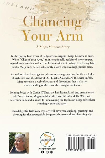 In the quirky Irish town of Ballycarrick, Sergeant Mags Munroe is busy. When Chance Your Arm, an internationally acclaimed showjumper, mysteriously vanishes and a troubled celebrity seeks refuge in a luxury Irish castle, Mags finds herself reluctantly drawn into two high-profile cases. As well as crime investigation, she must manage feuding families, a leaky church roof and the dreadful D.I. Duckie Cassidy. As the cases unfold, Mags uncovers a web of secrets and deceptions that shake her understanding of the town she thought she knew. Joining forces with Conor O'Shea, the handsome, kind and astute owner of Castle Dysert, Mags combines their considerable skills. With wit, determination, and a knack for uncovering the truth, can Mags solve these seemingly unrelated cases? This delightful Irish cosy mystery will have you laughing, guessing, and cheering for the irrepressible Sergeant Munroe and her charming ally.