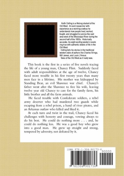 "Chancy Flint" tells the story of a twelve-year-old boy who is suddenly forced to accept adult responsibilities in Civil War era Kentucky. His mother is kidnapped by an evil Shawnee war chief. His father sets out to rescue her, leaving Chancy to care for his five-year-old brother, the family farm, and all the animals. Chancy faces many challenges at which most grown-ups would cringe. But we see him grow up straight and strong, tempered by adversity, not defeated by it.