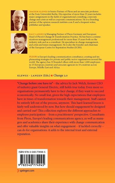 "Change before you have to" - the advice by Jack Welch, former CEO of industry giant General Electric, still holds true today. Even more so: organisations permanently have to face change, if they want to succeed economically. No small feat, given the high expectations that employees have in times of transformation towards their management. Staff cannot be entirely left out of the process, anymore. This hard-learned lesson is fairly well understood by now. But how should engagement be designed and carried out? This collection explores the different approaches to employee participation - from a practitoners' perspective. Consultants from Pleon, Europe's leading communications agency, as well as managers and academics share their experience with change communication and offer valuable insights on what engagement - if tackled correctly - can do for organisations: it adds to the internal trust and external reputation.