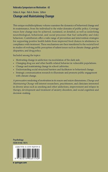 This unique multidisciplinary volume examines the dynamics of behavioral change and its maintenance, from the individual to the wider domains of public policy. Coverage traces how change may be achieved, sustained, or derailed, as well as underlying neurobiological, behavioral, and social processes that fuel unhealthy and risky behaviors. Contributors offer a wide range of prevention and intervention strategies for supporting positive health habits from improved food choices to abstinence to compliance with treatment. These mechanisms are then transferred to the societal level in studies of evolving public perception of salient issues such as climate change, gender disparities, and drug policy.