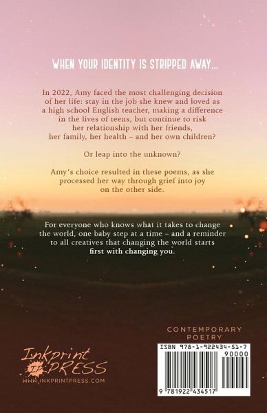 In 2022, Amy faced the most challenging decision of her life: stay in the job she knew and loved as a high school English teacher, making a difference in the lives of teens, but continue to risk her relationship with her friends, her family, her health - and her own children? Or leap into the unknown? Amy's choice resulted in these poems, as she processed her way through grief into joy on the other side. For everyone who knows what it takes to change the world, one baby step at a time - and a reminder to all creatives that changing the world starts first with changing you.