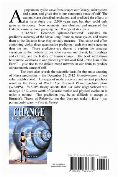 A gargantuan cyclic wave force shapes our Galaxy, solar system and planet. The Maya described, explained, and predicted the effects of that wave force over 2,100 years ago, but could only guess at its source. Now scientists have measured that Galactic cause. 'CHANGE; Described-Explained-Predicted' validates the predictive accuracy of the Maya Long Count Calendar cycles and relates them to the Galactic force they measure. That force predicts the motions of our solar system and planet, Earth's shape and climate, and the history of human change. The book shows how our planet's gravitational field gives rise to our brain's default mode network and produces our autonomic sense of self. CHANGE reveals the scientific basis for the Maya predicted Transformation of our solar neighborhood in 2012; the theory of World Age Resonant Phase Synchronization (WARPS). WARPS predicts that our solar neighborhood will undergo 4,612 years of Galactic motion and physical evolution in under a minute.