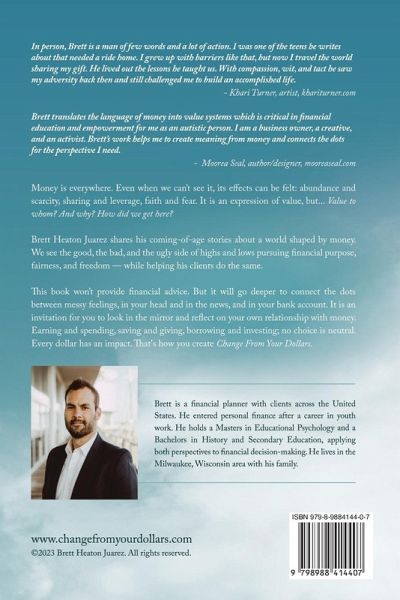 Money is everywhere. Even when we can't see it, its effects can be felt: abundance and scarcity, sharing and leverage, faith and fear. It is an expression of value, but ... Value to whom? And why? How did we get here? Brett Heaton Juarez explores these questions and more throughout a thoughtful Millennial money chronicle, from his quintessential suburban upbringing outside of Chicago to the harsh realities of nonprofit youth work, and the highs and lows of joining finances with his Compton-raised wife, pivoting careers, and supporting a growing family - all while chasing his dreams and seeking to make a difference in the world. This book won't provide financial advice. But it will go deeper to connect the dots between messy feelings, in your head and in the news, and in your bank account. It is an invitation for you to look in the mirror and reflect on your own relationship with money. Earning and spending, saving and giving, borrowing and investing; no choice is neutral. Every dollar has an impact. That's how you create Change From Your Dollars. "In person, Brett is a man of few words and a lot of action. I was one of the teens he writes about that needed a ride home. I grew up with barriers like that, but now I travel the world sharing my gift. He lived out the lessons he taught us. With compassion, wit, and tact he saw my adversity back then and still challenged me to build an accomplished life." - Khari Turner, artist "Brett translates the language of money into value systems which is critical in financial education and empowerment for me as an autistic person. I am a business owner, a creative, and an activist. Brett's work helps me to create meaning from money and connects the dots for the perspective I need." - Moorea Seal, author/designer Find out more about how you can create Change From Your Dollars by visiting www.changefromyourdollars.com
