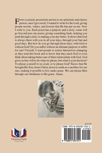 From a cynical, pessimistic person to an optimistic and cheery person, once I got saved, I wanted to write for the Lord, giving people morals, values, and lessons that He has put on me. Now I write to you. Each poem has a purpose and a story; some will go beyond just one poem, giving something back, helping you push through a trial, or making your day better. It shows that God is always there with you in all your days, through your bad and good days. But how do you go through those days, with God or without God? Do you suffer without an ultimate purpose or suffer for one? Overall, I want people to notice themselves changing as they read this book and to know that they need God or even think about taking better care of their relationship with God. God gives us free will to do what we please, but what is your decision? To please yourself to no avail, or to please God? Know that He brought His Son, Jesus Christ, down to earth as a sacrifice for our sins, making it possible to live under grace. We can please Him through our obedience to His grace. Amen.