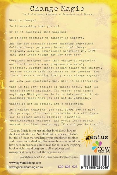 What is change? Is it something that you do? Or is it something that happens? Is it even possible to change? To improve? And why are managers and leaders always changing something? Culture change programs, behavioural change programs, service improvement programs? Why can't people just leave things the way they are? Corporate managers know that change is expensive, and traditional change programs are largely ineffective. Culture change doesnt change the culture, because culture isn't the cause of the problem, and it's not even something that you can change anyway. And yet, you absolutely know when it is different. This is the very essence of Change Magic, that you cannot improve anything. You cannot even change anything. What you can do is to take action, to do something today that you did not do yesterday. Change is not an action, it's a perception. As a Change Magician, you will learn how to make change easy, effortless, invisible. You will learn how to create agile, flexible, adaptable organisational cultures. And you'll leave people amazed, thrilled, wondering, "How did you do that?"