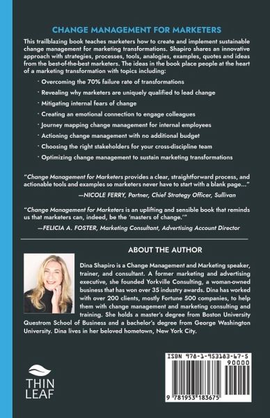This trailblazing book teaches marketers how to create and implement sustainable change management for marketing transformations. Shapiro shares an innovative approach with strategies, processes, tools, analogies, examples, quotes and ideas from the best-of-the-best marketers. The ideas in the book place people at the heart of a marketing transformation with topics including:Overcoming the 70% failure rate of transformations Revealing why marketers are uniquely qualified to lead change Mitigating internal fears of change Creating an emotional connection to engage colleagues Journey mapping change management for internal employees Actioning change management with no additional budget Choosing the right stakeholders for your cross-discipline team Optimizing change management to sustain marketing transformations
